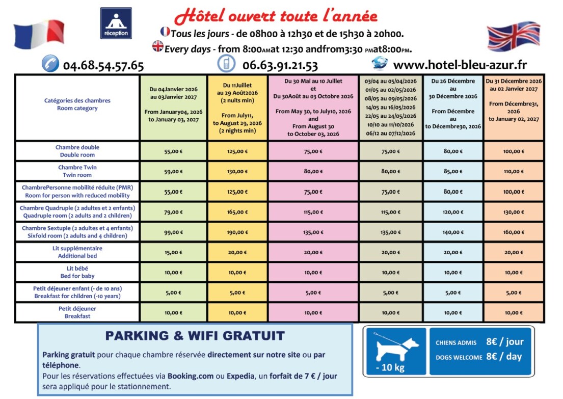 TARIFS HOTEL BLEU AZUR - Hotel *** Bleu Azur, Hotel Argeles sur Mer,